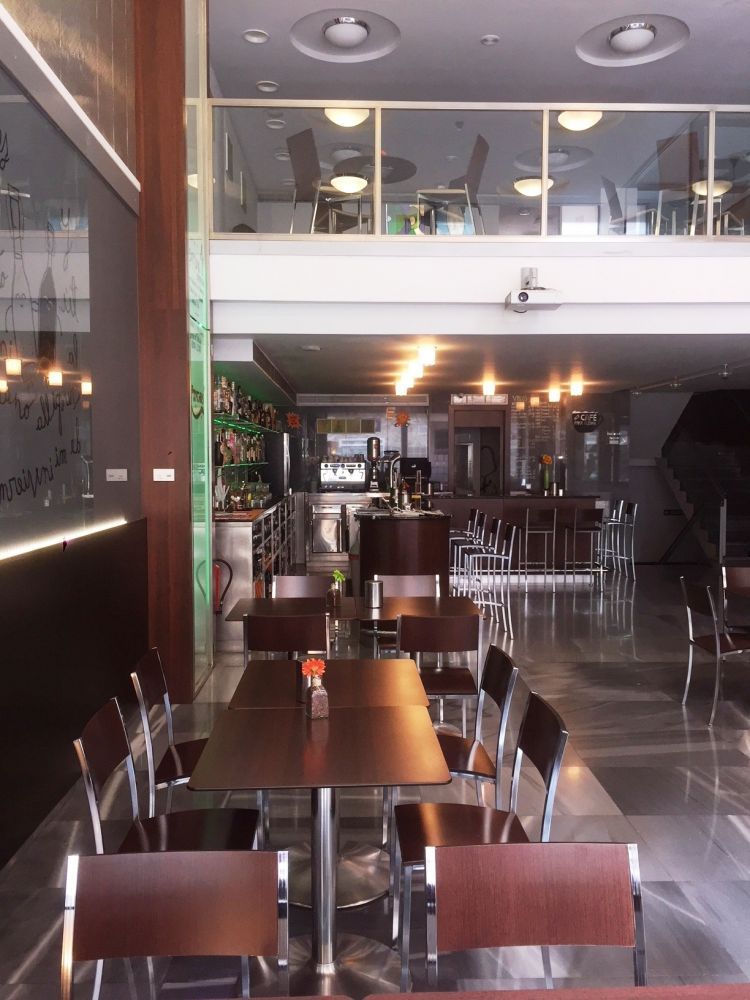 Dispuesto al deleite del público en un salón de diseño minimalista, la cafetería cuenta con amplitud, mucha luz natural, sofás, TV, etc. y ofrecemos servicio de comidas y cenas para grupos, con menús desde 18€.